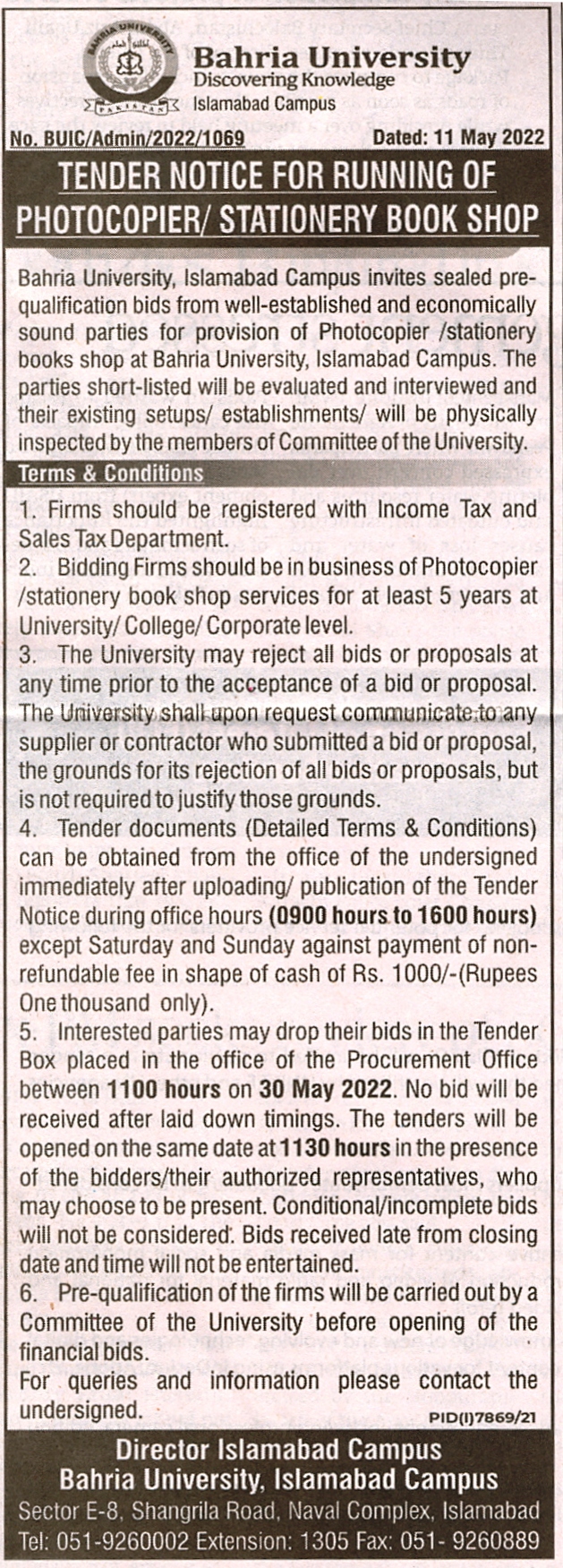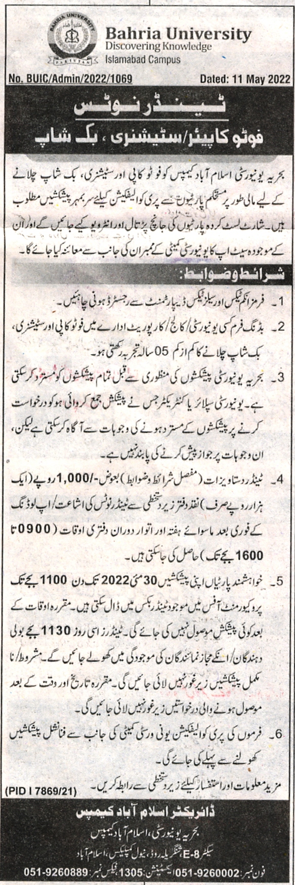 Tender Notice for Running of Photocopier/Stationery Book Shop