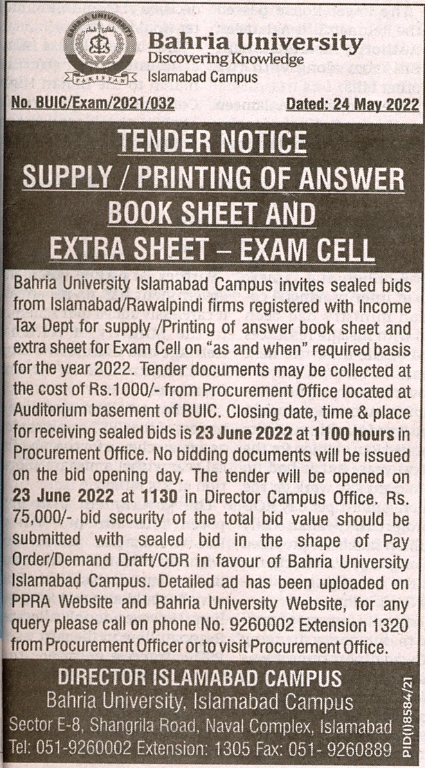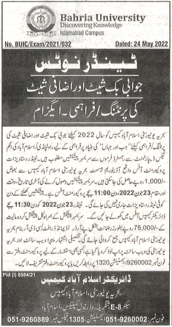 Tender Notice - Supply / Printing of Answer Book Sheet and Extra Sheet - Exam Cell