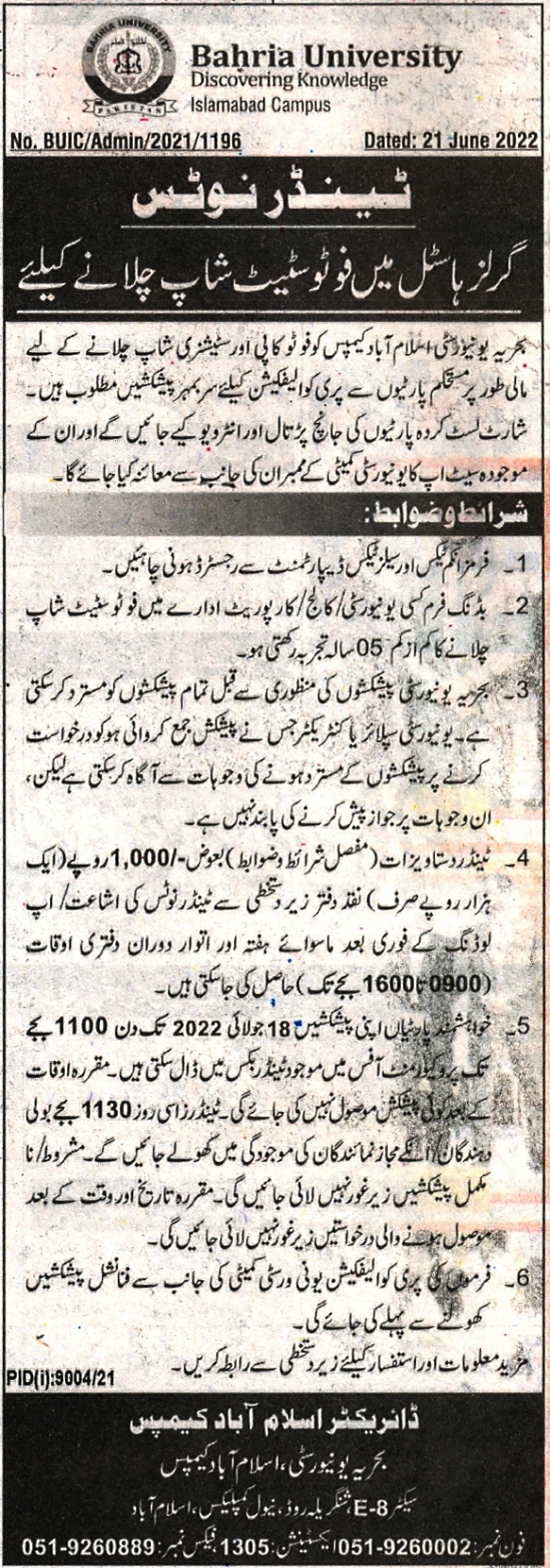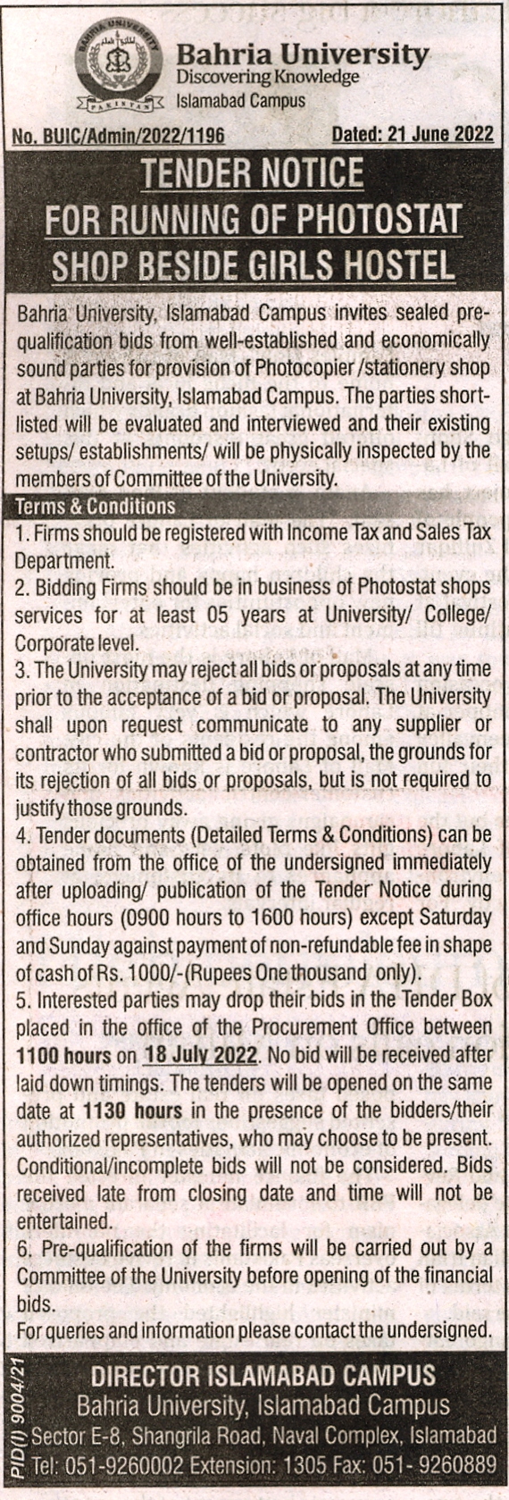 Tender Notice for Running of Photostat Shop Beside Girls Hostel