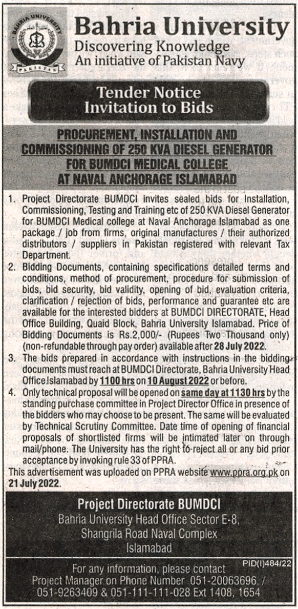 Procurement. Installation and Commissioning of 250 KVA Diesel Generator for BUMDCI Medical College at Naval Anchorage Islamabad