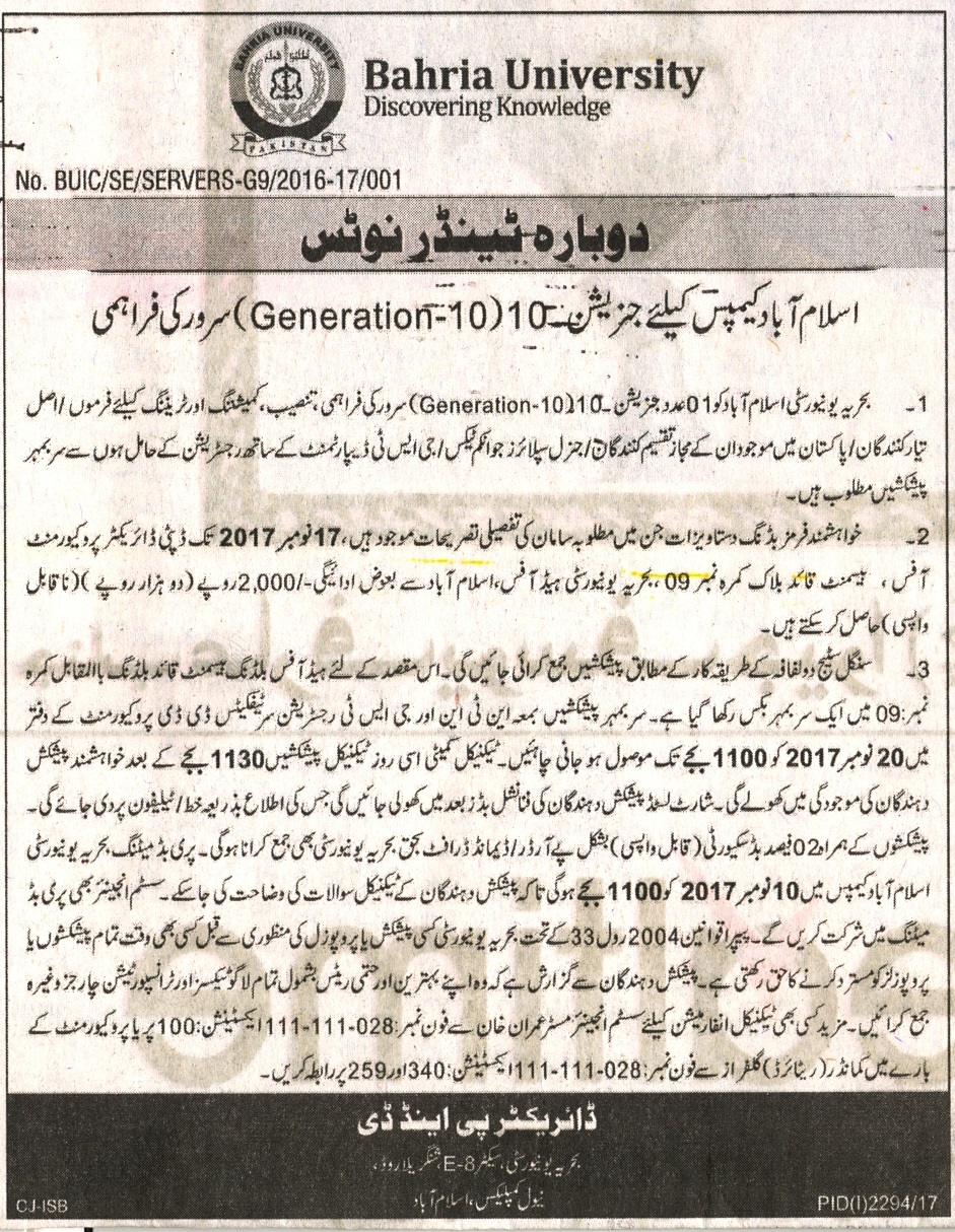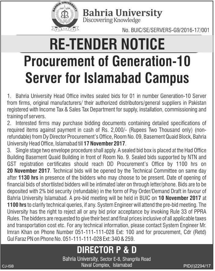 Re-Tender Notice Procurement of Generation-10 Server for Islamabad Campus