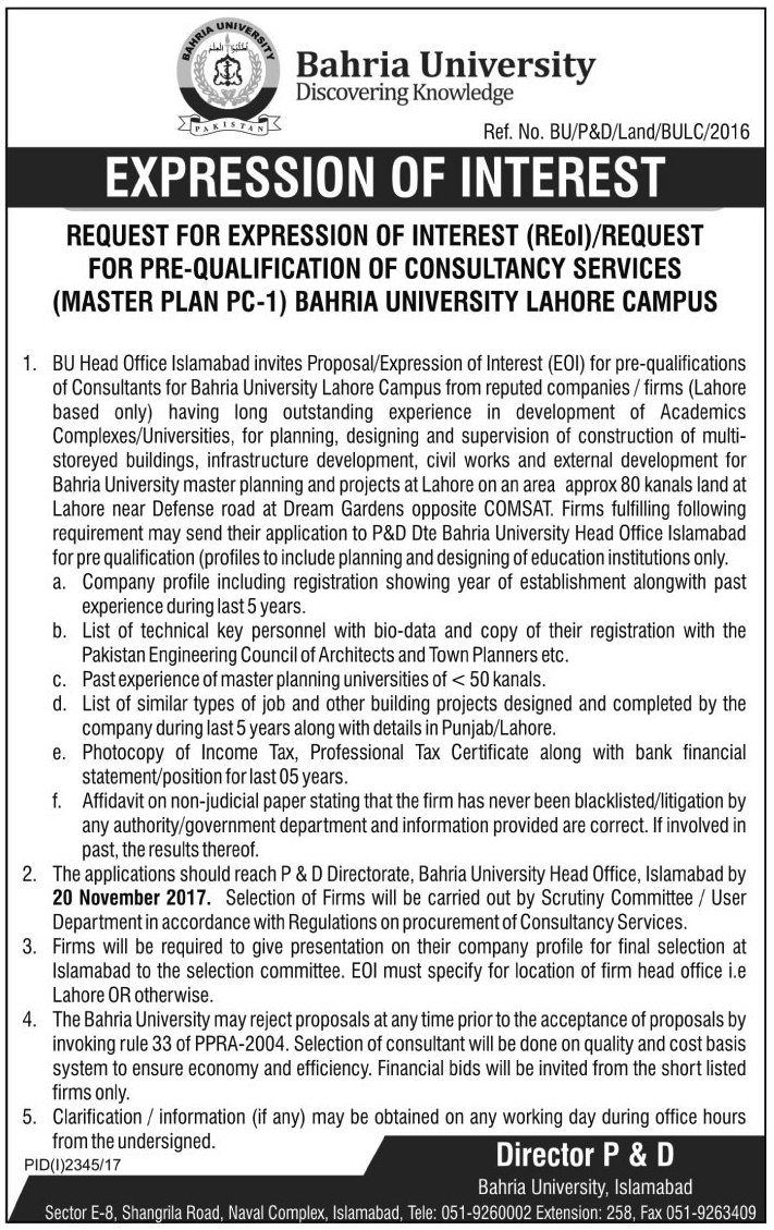 Request for expression of interest (REoI)/request for pre-qualification of consultancy services (Master Plan PC-1) Bahria University Lahore Campus