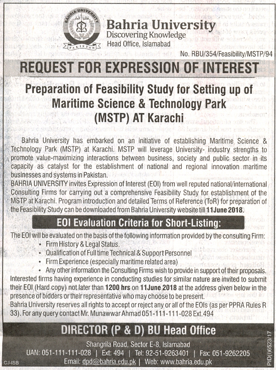 Preparation of Feasibility Study for Setting up of Maritime Science & Technology Park (MSTP) at Karachi