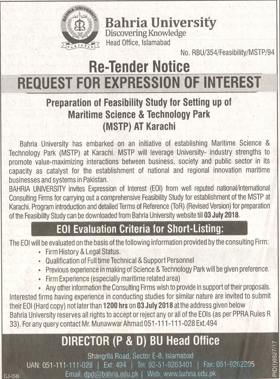 Re-Tender Notice Preparation of Feasibility Study for Setting up of Maritime Science & Technology Park (MSTP) at Karachi