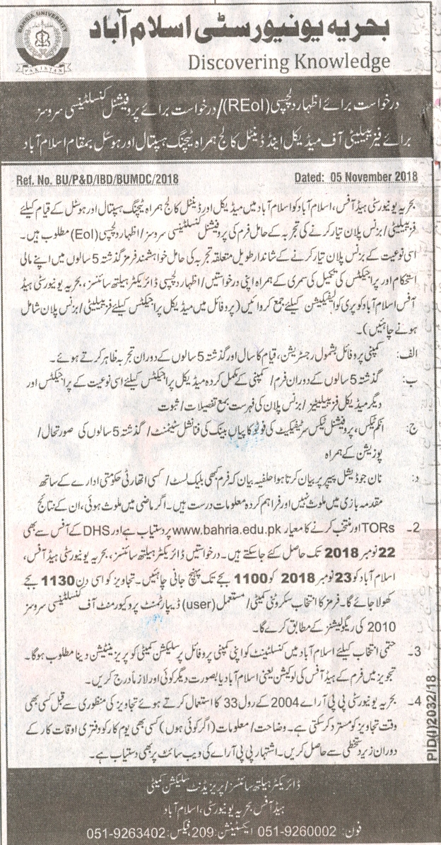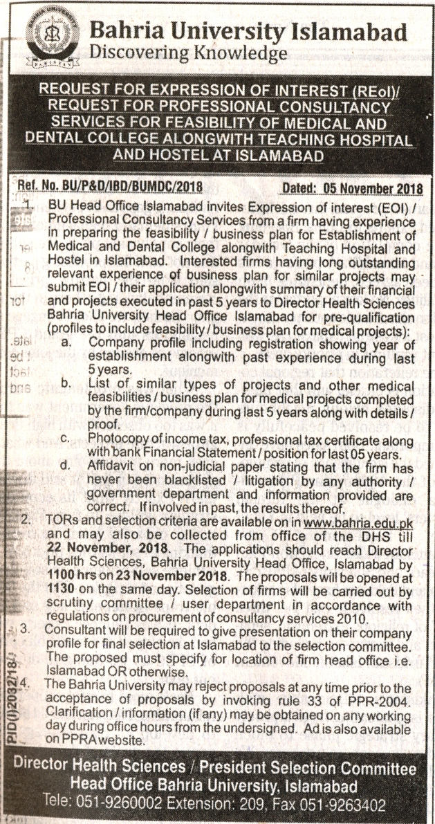 Request for expression of interest (REoI)/request for professional consultancy services for feasibility of medical and dental college along with teaching hospital and hostel at Islamabad