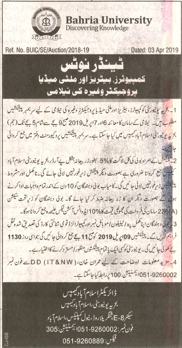 Tender Notice Auction of Computers, Batteries, and Multimedia Projector etc.
