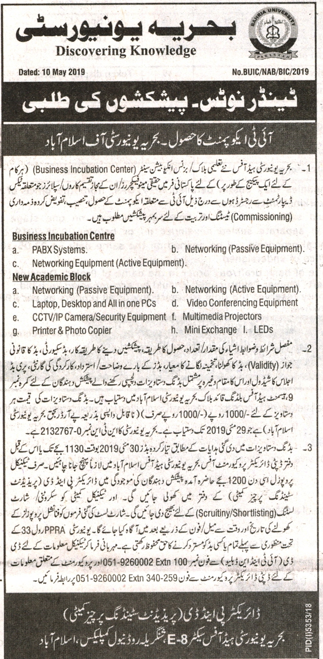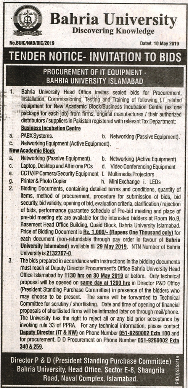 Tender Notice - Invitation to Bids "Procurement of IT Equipment Bahria University Islamabad"