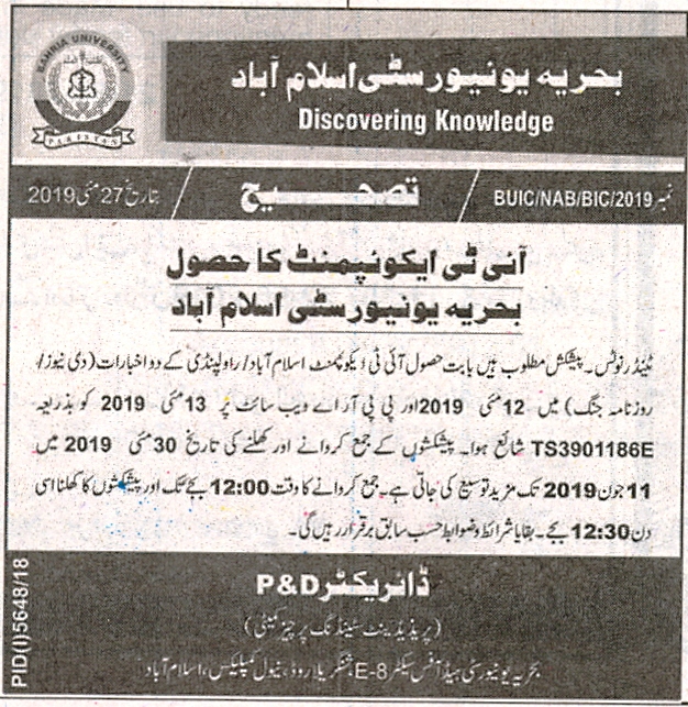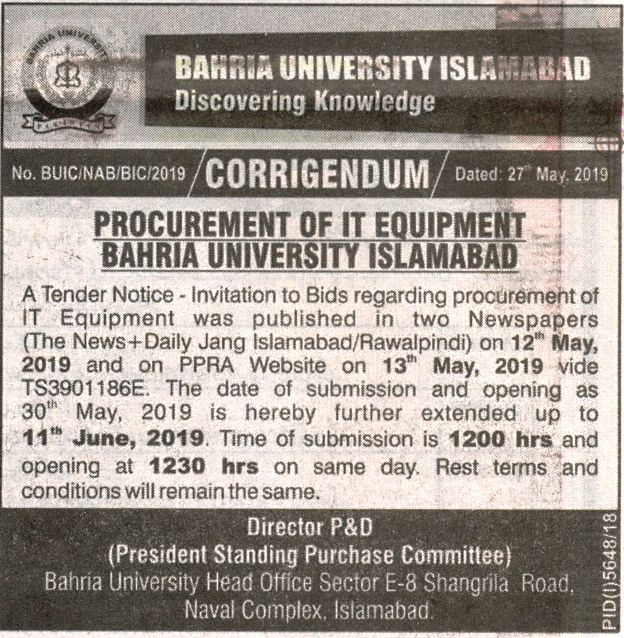 Corrigendum Procurement of IT Equipment Bahria University Islamabad