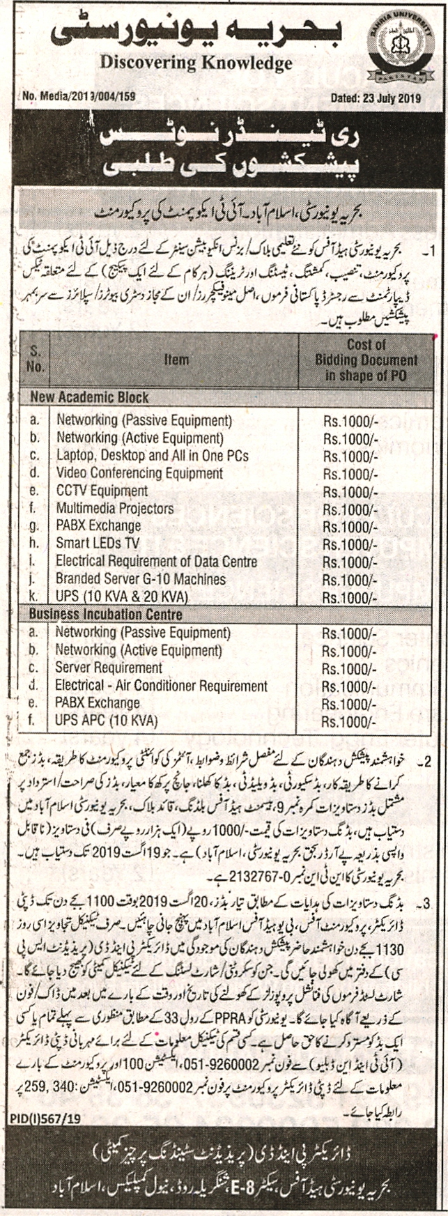 Re-Tender Notice Invitation to Bids Procurement of IT Equipment Bahria University Islamabad
