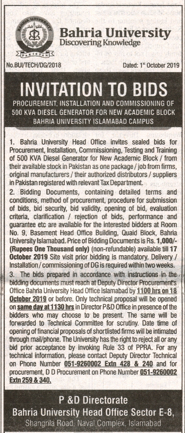 Invitation to Bids Procurement, Installation and commissioning of 500 KVA Diesel Generator for New Academic Block Bahria University Islamabad Campus