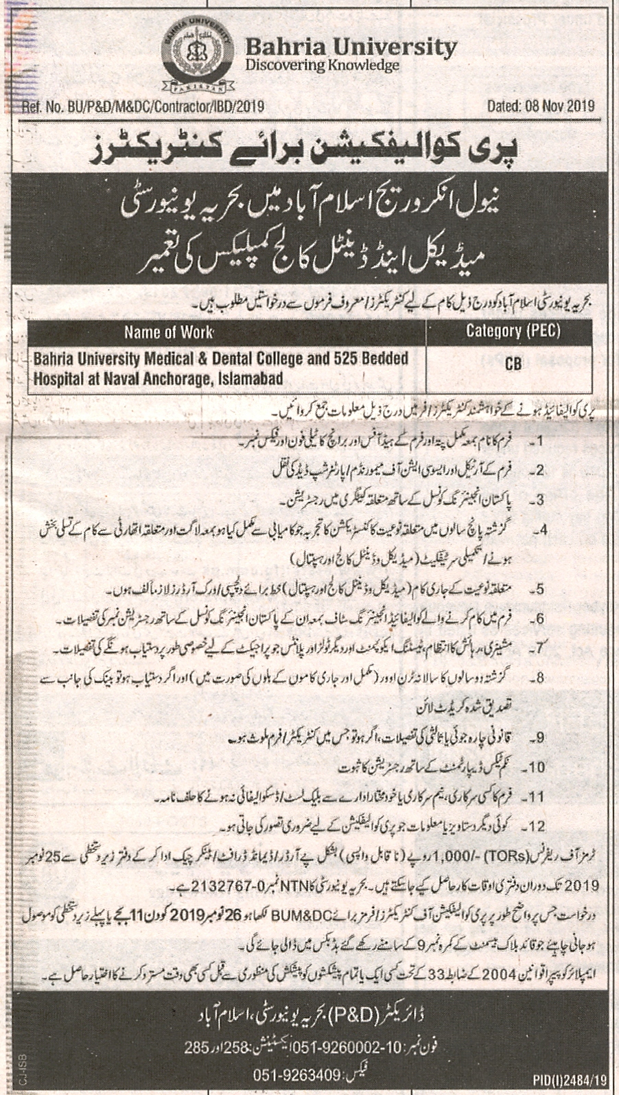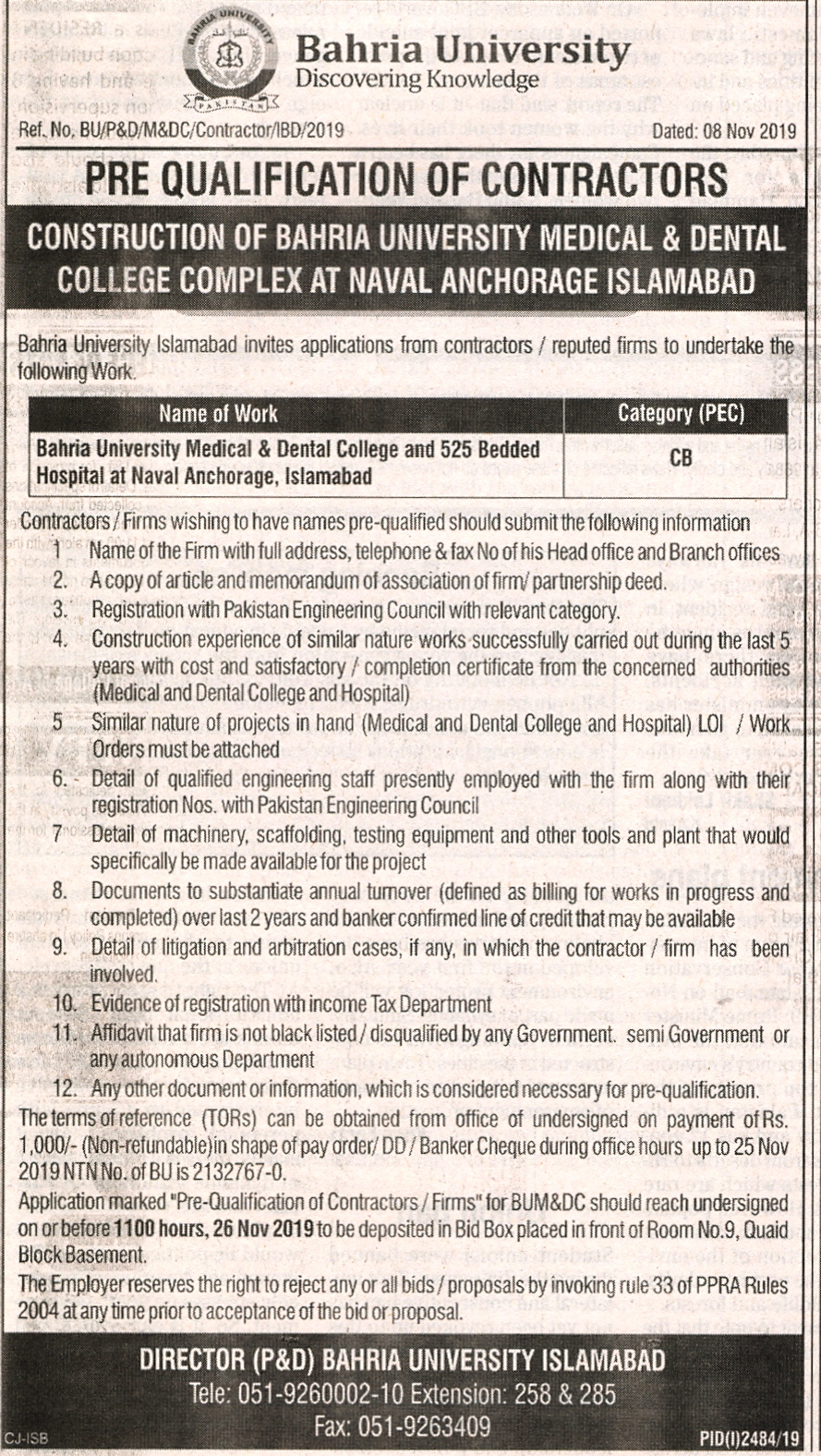 Pre Qualification of Contractors Construction of Bahria University Medical & Dental College complex at Naval Anchorage Islamabad