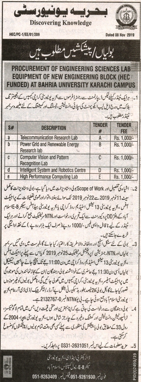 Invitation of Bids/Proposal Procurement of Engineering Sciences Lab Equipment of New Engineering Block (HEC Funded) at Bahria University Karachi Campus