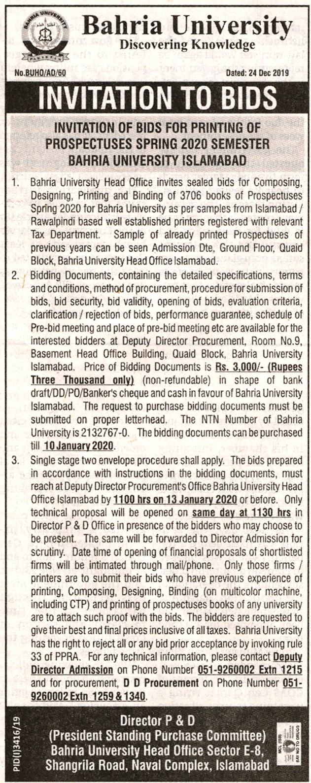 Invitation of Bids Printing of Prospectuses Spring 2020 Semester Bahria University Islamabad