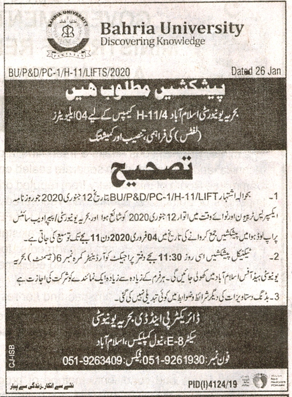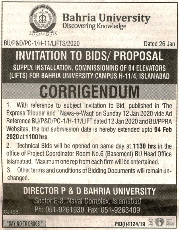 Corrigendum Invitation of Bids/Proposal Supply, Installation, Commissioning of 04 Elevators (Lifts) for Bahria University Campus H-11/4 Islamabad