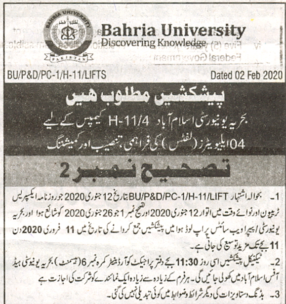 Corrigendum No. 2 Invitation of Bids/Proposal Supply, Installation, Commissioning of 04 Elevators (Lifts) for Bahria University Campus H-11/4 Islamabad