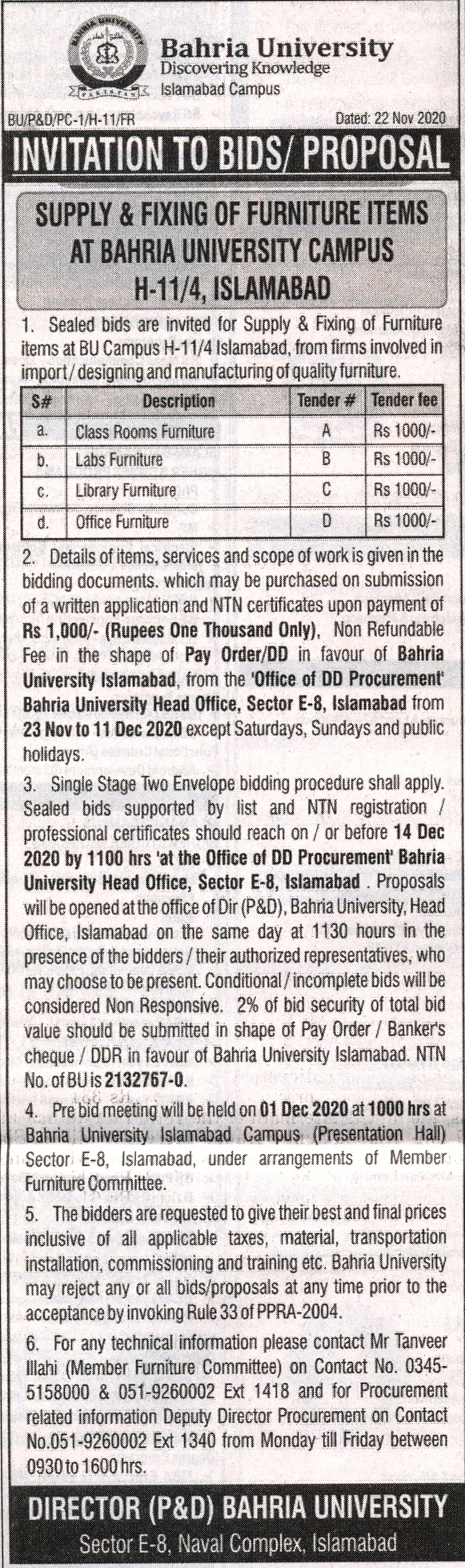 Supply & Fixing of Furniture Items at Bahria University Campus H-11/4 Islamabad