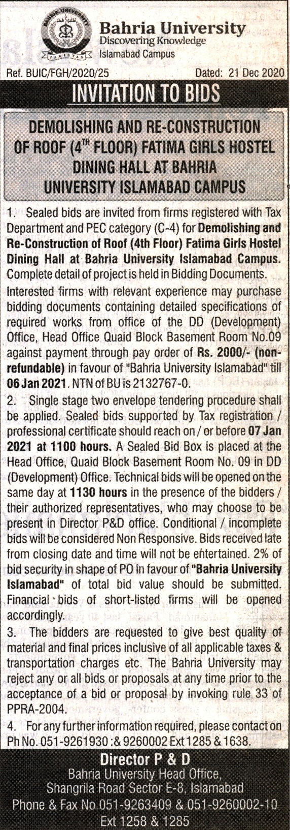 Demolishing and Re-Construction of Roof (4th floor) Fatima Girls Hostel Dining Hall at Bahria University Islamabad Campus